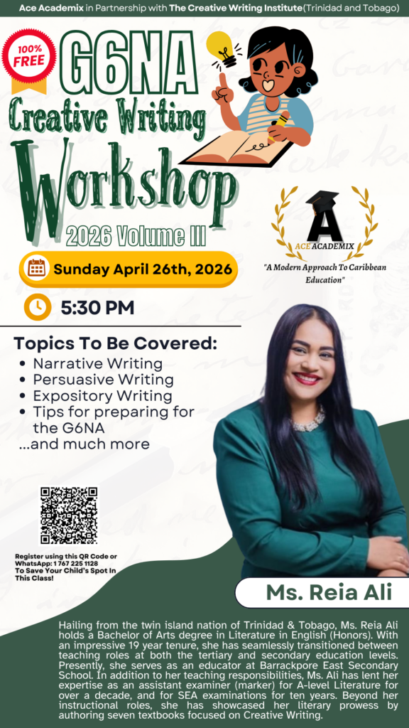 Ace Academix, a leading educational institution known for its modern approach to Caribbean education, is pleased to announce the hosting of its Third Annual Free Online Creative Writing Workshop, in collaboration with the Creative Writing Institute of Trinidad and Tobago.